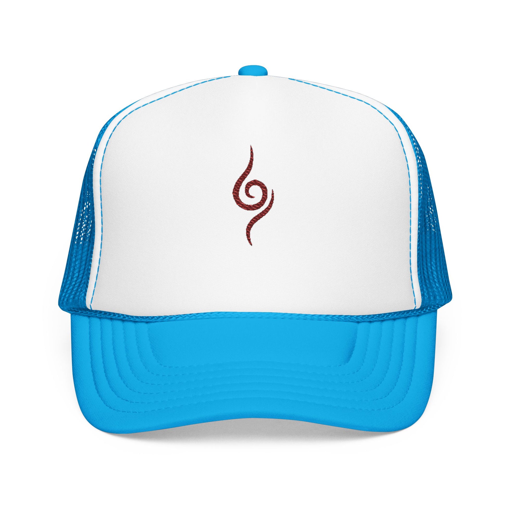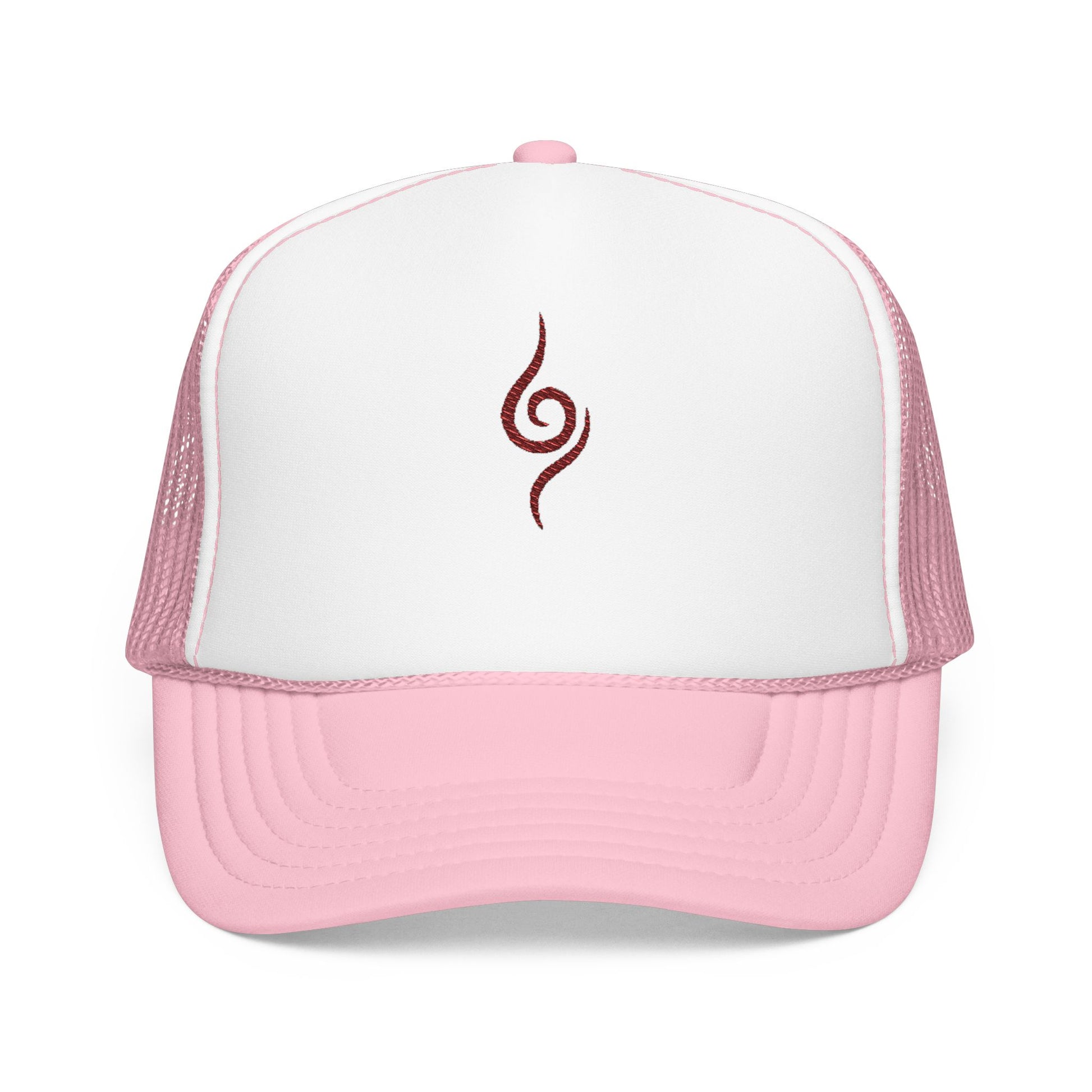 Embroidered Spiral Symbol Trucker Hat — Red Foam Mesh Cap
